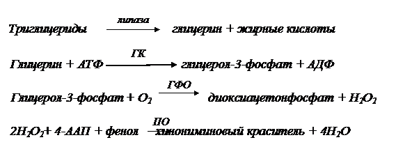 глицерокиназой (ГК) в присутствии АТФ, глицеролфосфатоксидазой (ГФО) и