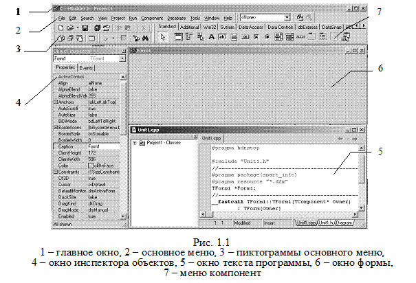 Главное окно служит для управления процессом создания программы. Основное меню содержит все необходимые средства для управления проектом. Пиктограммы облегчают доступ к наиболее часто применяемым командам основного меню. Через меню компонент осуществляется доступ к набору стандартных сервисных программ среды, которые описывают некоторый визуальный элемент (компоненту), помещенный программистом в окно формы. Каждая компонента имеет определенный набор свойств, которые задаются Пользователем, например, заголовок окна, надпись на кнопке, стиль выводимого текста и т.п.