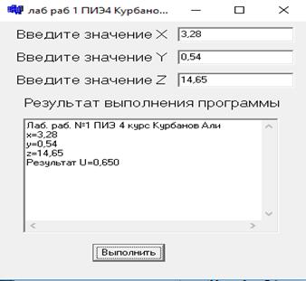 (щелкните мышью) по кнопке “Выполнить”. В окне Memo1 появится результат. Измените исходные значения x, y, z в окнах Edit и снова нажмите кнопку «Выполнить» - появятся