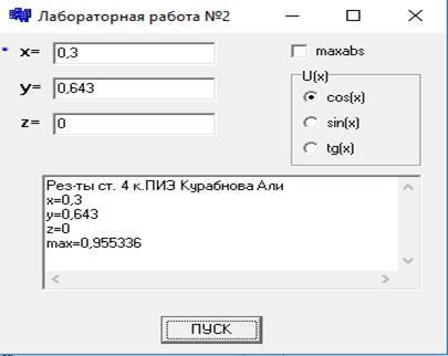 Задание: ввести три числа - x,y,z. Вычислить по усмотрению u=sin(x), u=cos(x) или u=tg(x). Найти по выбору максимальное из трех чисел: max(u,y,z), или max (|u|,|y|,|z|). Cоздать форму, представленную на рис. 2.1, и написать соответствующую программу.