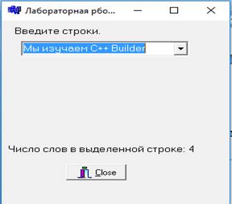 Задание: написать программу подсчета числа слов в произвольной строке. В качестве разделителя может быть любое число пробелов. Для ввода строк и работы с ними использовать TComboBox. Ввод строки заканчивать нажатием клавиши Enter. Для выхода из программы использовать кнопку Close.