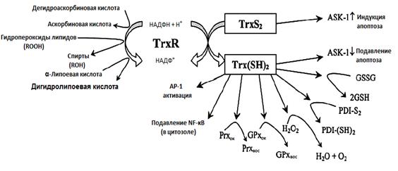 Схематическое изображение основных физиологических функций системы тиоредоксина: TrxR – тиоредоксинредуктаза;
