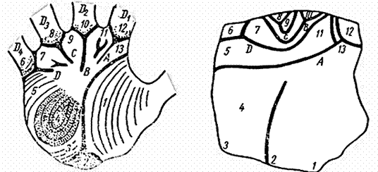 линий, образуют ладонные поля. Выделяют 13 полей, которые обозначают цифрами,