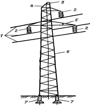 2 – изоляторы; 3 – грозозащитный трос; 4 – тросостойка;
