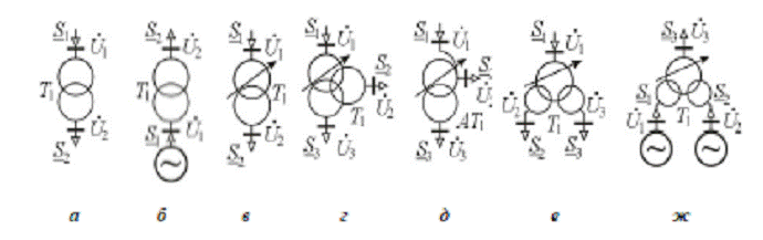Условные обозначения трансформаторов и автотрансформаторов на схемах: а, б – двухобмоточные нерегулируемые; в – регулируемый; г – трёхобмоточный регулируемый; д – автотрансформатор; е