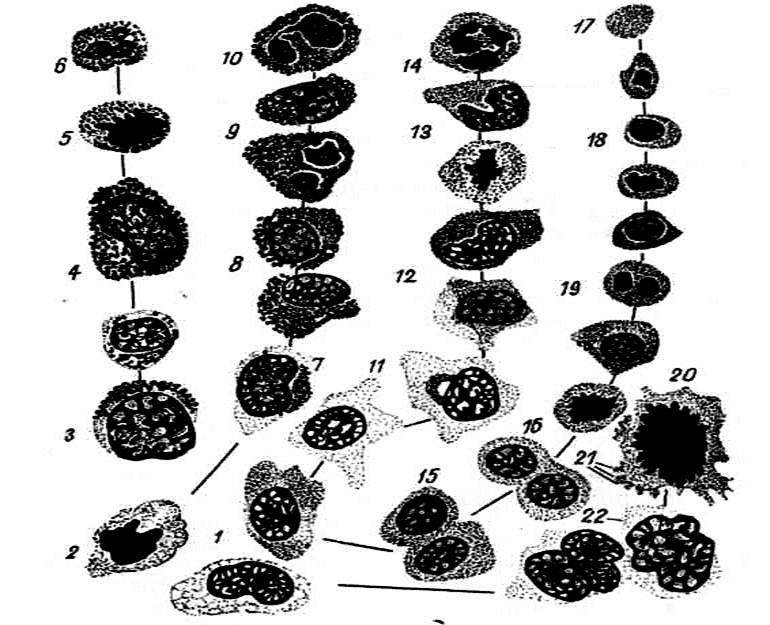 Рис.16. Различные стадии развития форменных элементов крови в красном