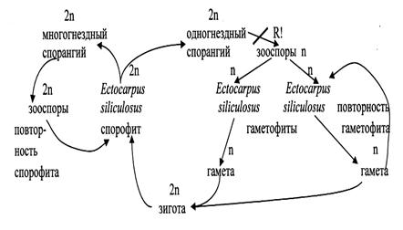 На диплоидном спорофите в одногнездных спорангиях, представляющих собой конечные клетки боковых ветвей, происходит редукционное деление ядра. При этом образуются гаплоидные двужгутиковые зооспоры. Они вырастают в гаплоидные растения – гаметофиты, которые по внешнему виду и размеру не отличаются от спорофита. На гаметофитах в многогнездных гаметангиях (спорангиях) формируются изогаметы. Внешне они одинаковы, но отличаются подвижностью. Те, которые быстро теряют подвижность, являются женскими гаметами. Они выделяют сильно пахучее, летучее вещество эктокарпен (углеводород), привлекающий мужские гаметы. Одна из них производит оплодотворение. Зигота без периода покоя прорастает в диплоидное бесполое растение – спорофит. Иногда гаметы прорастают партеногенети чески (без оплодотворения) и тогда появляются растения, подобные спорофитам или гаметофитам.