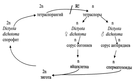 Вершина каждой ветви заканчивается одной крупной клеткой, за счет чего происходит ее нарастание. В центре располагается один слой крупных бесцветных клеток, окруженный снаружи корой из одного слоя мелких интенсивно окрашенных клеток. Из поверхностных клеток спорофита развиваются крупные одногнездные тетраспорангии. Они располагаются сорусами. После редукционного деления в них образуется по четыре гаплоидные неподвижных тетраспоры. Они прорастают в мужские и женские гаметофиты, внешне похожие на спорофит. На половой генерации гаметангии собраны группами – сорусами. На мужских растениях сорус состоит из нескольких многокамерных антеридиев (антеридии делятся горизонтальными и вертикальными перегородками на 150-1500 камер). В каждой камере образуется один одножгутиковый сперматозоид (антерозоид). На женских растениях сорусы состоят из нескольких одноклеточных оогониев, содержащих по одной яйцеклетке. При созревании они вываливаются из оогониев в воду, где и происходит оплодотворение. Половой процесс оогамный. Зигота прорастает в спорофит (тетраспорофит) без периода покоя. Т.о., смена поколений изоморфная.