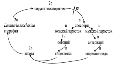 У ламинариевых налицо чередование двух гетероморфных поколений: сложно рассеченного, дифференцированного, макроскопического спорофита и примитивно устроенного, несколько клеточного, микроскопического гаметофита.