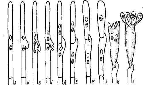 У перегородки, отделяющей апикальную клетку дикариотичной гифы, начинает формироваться пряжка в виде небольшого бокового выроста (рис.5. А, Б). Вскоре после этого одновременно делится пара ядер дикариона, причем оси деления лежат на одном уровне и вдоль клетки (рис.5. В). В результате деления в клетке образуются четыре ядра. Сама клетка также делится, и одна пара несестринских ядер остается в верхней материнской клетке базидии (рис.5. Г-Е). В дальнейшем эти ядра сливаются и диплоидное ядро редукционно делится. Сама клетка обычно вытягивается, образуя базидию. На ее вершине формируются выросты - стеригмы, которые, вздуваясь на конце, развиваются в базидиоспоры (рис.5. Ж-К). В каждую базидиоспору через узкий просвет стеригмы протискивается по одному ядру. При созревании базидиоспоры отбрасываются со стеригмы на небольшое расстояние. Из оставшейся пары ядер одно остается в нижней клетке-ножке, а второе попадает в боковой вырост – пряжку, еще не отделенную перегородкой от материнской клетки базидии (рис.5. Г).
