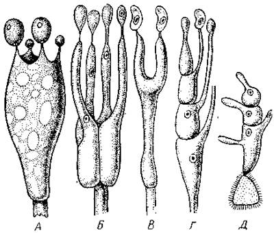 А - холобазидия; Б, В, Г - гетеробазидии; Д - телиобазидия или фрагмобазидия