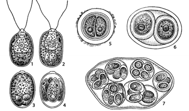 2–4 – процесс образования зооспор; 5–7 – пальмеллевидное состояние и размножение внутри слизи