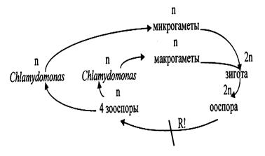 В благоприятных условиях размножение бесполое (с помощью, зооспор). При этом клетки останавливаются и последовательно в продольном направлении делятся на 2, 4 или 8 частей. Эти дочерние клетки вырабатывают жгутики, и после ослизнения материнской оболочки выплывают наружу в виде мелких зооспор, которые растут до размера материнской особи. Половой процесс изогамный (рис.11). Он происходит при неблагоприятных условиях. Гаметы образуются внутри материнской клетки так же, как и зооспоры, но в большем количестве и более мелких размеров. Т.о., особь является гаметоспорофитом. Описаны гетерогамия и оогамия, но это исключения. У многих видов наблюдается гетероталлизм (сливаются гаметы различных разно заряженных особей). После слияния ядер сливаются и пластиды. Вначале зигота сохраняет жгутики и плавает. Затем, жгутики сбрасываются, и выделяется плотная оболочка (первичная и чуть позже вторичная). Диплоидная зигота впадает в состояние покоя. В течение этого периода она или остается прежних размеров, или увеличивается. Но в любом случае в ней накапливаются питательные вещества, поэтому многие ботаники считают зиготу самостоятельно существующим организмом - спорофитом. Затем зигота прорастает. Ее содержимое при этом делится мейотически с образованием четырех зооспор. Таким образом, все стадии жизненного цикла у хламидомонады (за исключением зиготы) протекают в гаплоидном состоянии. Таким образом, цикл развития хламидомонады антитетический (со сменой поколений): гаплоидный одноклеточный гаметофит, способный к половому и бесполому размножению и диплоидный одноклеточный спорофит (так называемая зигота)