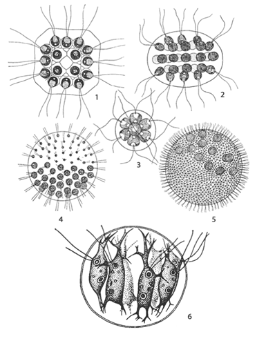 Рис. 12. Представители порядка Volvocales:1 – Gonium; 2 – Eudorina; 3 – Pandorina; 4 – Pleodorina; 5 – Volvox; 6 – Stephanosphaera
