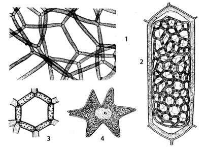 Рис. 13. Hydrodictyon: 1 – участок взрослого ценобия; 2 – молодая сеточка внутри материнской клетки; 3 – часть ювенильного ценобия; 4 – полиэдр
