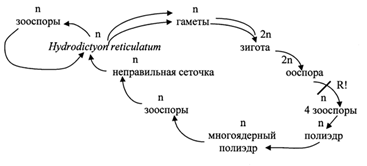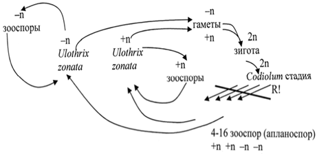 Соотношение диплоидной и гаплоидной фаз в жизненном цикле развития водорослей неодинаково. В одних случаях прорастание зиготы сопровождается редукционным делением, при этом развивающиеся растения оказываются гаплоидными, и, единственная диплоидная стадиия в цикле - зигота, а вся вегетативная фаза проходит у них в гаплоидном состоянии, они являются гаплобионтами. У других водорослей, наоборот, вся вегетативная фаза диплоидна, гаплоидная фаза представлена гамета-ми, перед образованием которых и происходит редукционное деление ядра. Зигота без редукционного деления прорастает в диплоидный таллом. Растения - диплобионты. У третьих, редукционное деление ядра предшествует образованию зооспор и аплапоспор, развивающихся на диплоидных талломах. Зооспоры прорастают в гаплоидные растения, размножающиеся только половым путем. После слияния гамет зигота развивается в диплоидное растение, несущее только органы бесполого размножения. У этих водорослей имеет место чередование поколений: диплоидного бесполого спорофита и гаплоидного полового гаметофита. Оба поколения могут быть одинаковы морфологически (изоморфная смена поколений) или резко различны по внешнему виду (гетероморфная смена поколений).