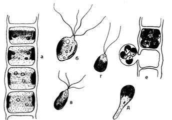 Рис. 14. Ulothrix zonata: а – внешний вид нити; б, в – зооспоры; г – гамета; д – прорастание зооспоры; е – образование зооспор