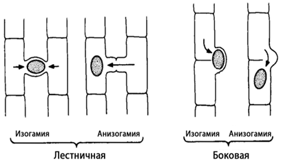 Конъюгация может быть лестничной и боковой (рис.16). Наиболее обычна последняя, которая происходит между клетками двух нитей. Нити располагаются параллельно друг другу и вначале склеиваются слизью. Затем противолежащие клетки образуют навстречу друг другу выросты, которые соприкасаются и срастаются своими концами.