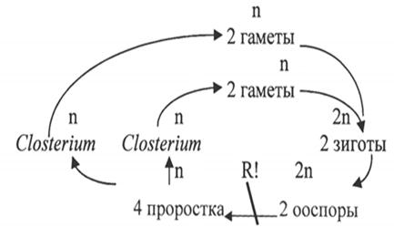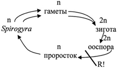 Удлиняясь, выросты постепенно раздвигают нити, и возникает фигура в виде лестницы. Стенки на концах соприкасающихся отростков растворяются, и возникает узкий конъюгационный канал. Протопласт одной из противолежащих клеток (отдающей) сокращается, отделяется от стенок и переползает в другую (воспринимающую) клетку, где сливается с ее содержимым, образуя зиготу. У некоторых видов слияние протопластов и образование зиготы происходит в конъюгационном канале. Образовавшаяся зигота округляется, выделяет толстую трехслойную оболочку и переходит в состояние покоя. При прорастании происходит редукционное деление. Из четырех гаплоидных ядер остается жизнеспособным только одно, которое и разовьется в гаплоидную нить. Цикл развития спирогиры происходит по гаплонтному типу, особь является гаметофитом.
