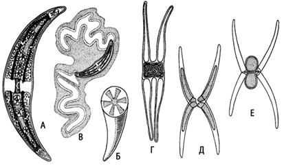 Рис. 17. Closterium: А – вид клетки сбоку; Б – поперечный разрез клетки; В – выделение масс слизи с концов клетки; Г – конъюгация;