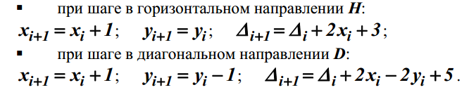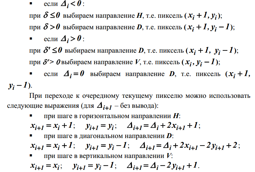 вне окружности или непосредственно на ней, и выбирается шаг D. При переходе к очередному текущему пикселю можно