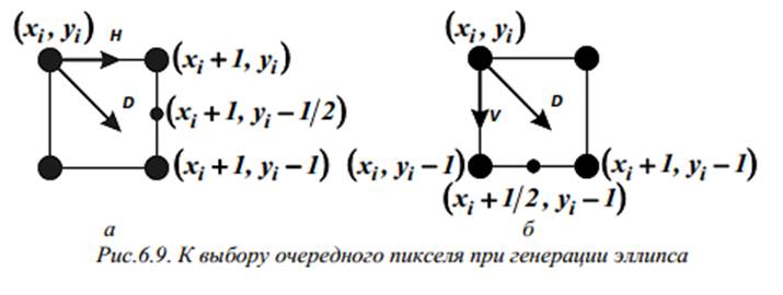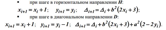 Если ∆i < 0, эллипс проходит выше средней точки, и выбирается шаг H; если ∆i<= 0, эллипс проходит ниже этой