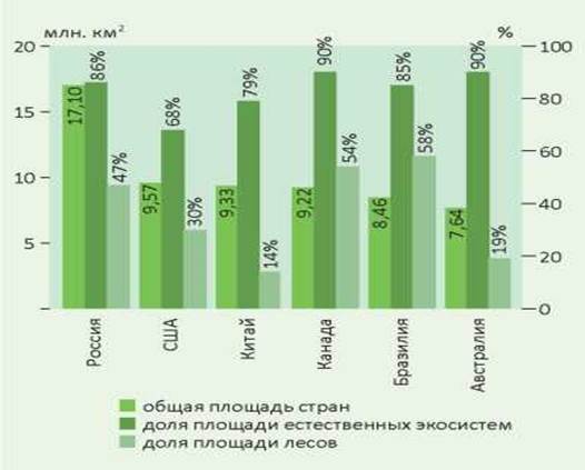 Рис. 1. Общая площадь и доля природных экосистем в крупнейших странах мира.