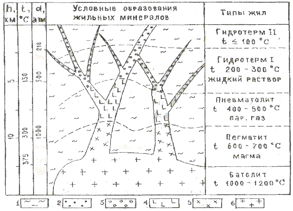 циркулирующие вдоль трещин в земной коре выше горизонта пневматолиза. При остывании растворов и их взаимодействии с вмещающими породами образуются весьма распространенные и характерные гидротермальные жилы, содержащие ценные руды металлов (золото, серебро,