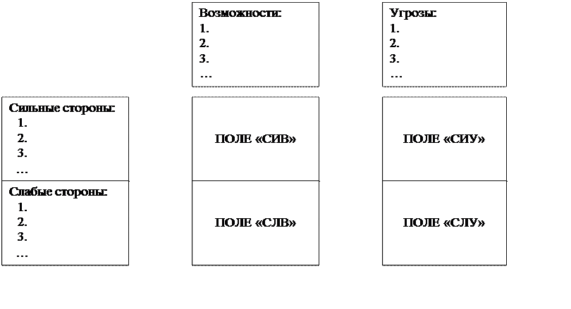 (сила и возможности); «СИУ» (сила и угрозы); «СЛВ» (слабость и возможность);