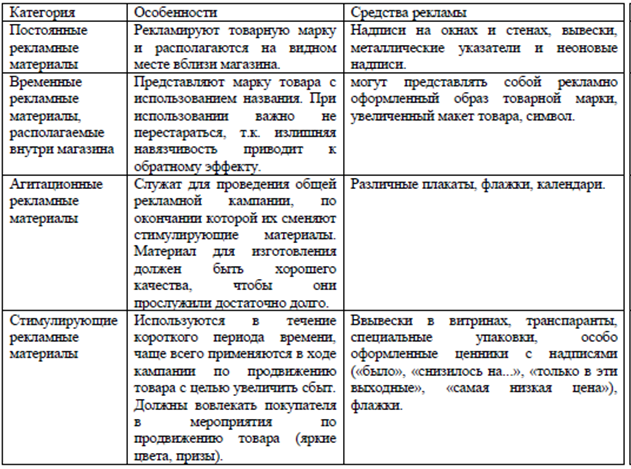 Таблица 9.2 - Классификация средств рекламы на месте продажи