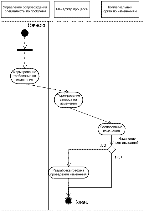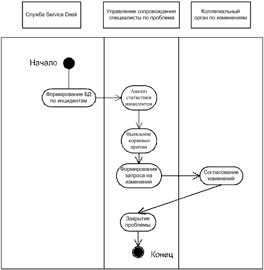 Возможный вариант диаграммы активности процесса управления доступностью приведен на рис. 2.6. На уровне процесса управления проблемами обнаружена известная ошибка. В рамках процесса управления доступностью сотрудник ИС-службы анализирует влияние компонентов ИТ-инфраструктуры на доступность различных сервисов и риск невыполнения SLA по этим сервисам при возникновении ошибки. На основе анализа подготавливаются предложения по изменениям ИТ-инфраструктуре. Если предложения принимаются, то подготавливается график проведения изменений.