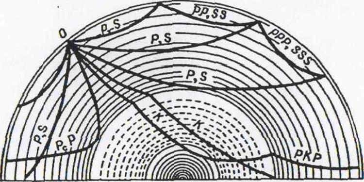 Пути основных сейсмологических волн в теле Земли; Р -