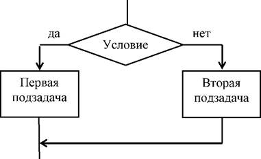 Конструкция принятия двоичного (дихотомического) решения называется также конструкцией If-Then-Else (если-то-иначе), разветвлением или ветвлением. Это структура, обеспечивающая выбор между двумя альтернативными путями вычислительного процесса в зависимости от выполнения некоторого условия. Изображается с помощью символов «Решение» и «Процесс»