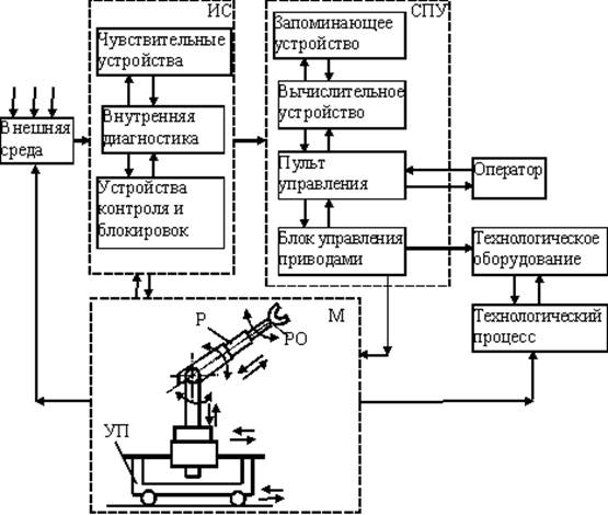 СПУ содержит: пульт управления (ПУ), с помощью которого оператор осуществляет ввод и контроль задания; запоминающее устройство (ЗУ), в котором хранится вся необходимая информация, включая программы работ; вычислительное устройство (ВУ), реализующее алгоритм управления манипулятором; блок управления приводами (БУП) механизмов манипулятора.