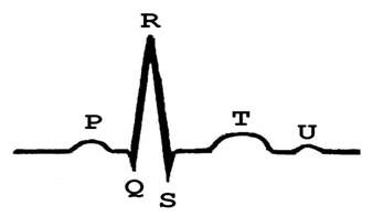 Рис. 10. Основные пики ЭКГ: Р – сокращение предсердий, QRS – сокращение желудочков, Т – расслабление