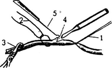 подготовленная к завязыванию центральная лигатура; 3 – зажим для временного пережатия сосуда; 4 – насечка на сосуде для введения канюли; 5 – крючок или пинцет для расширения отверстия